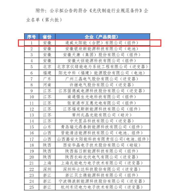 通威太陽能(合肥)有限公司入列《光伏制造行業(yè)規(guī)范條件》企業(yè)名單(第六批)
