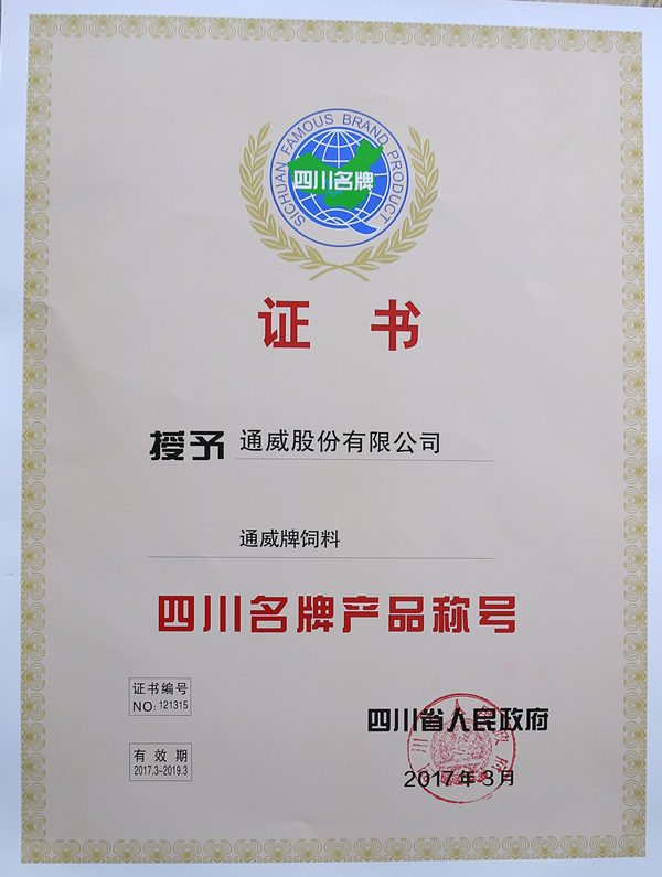 通威牌飼料蟬聯第十二屆四川名牌產品稱號