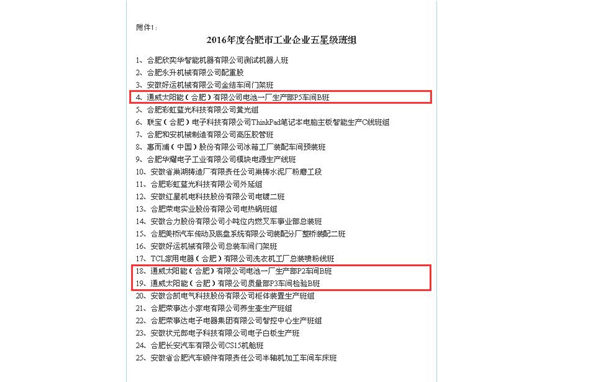 通威太陽能(合肥)有限公司獲評“2016年度合肥市工業(yè)企業(yè)五星級班組”