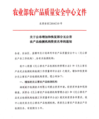 海南威爾公司成功獲得農業部無公害農產品檢測資格