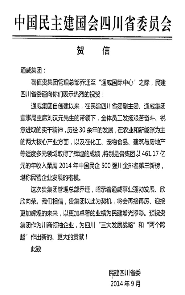 民建四川省委恭祝通威集團喬遷大吉