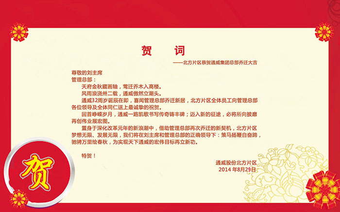 通威股份北方片區恭賀通威集團總部喬遷大吉