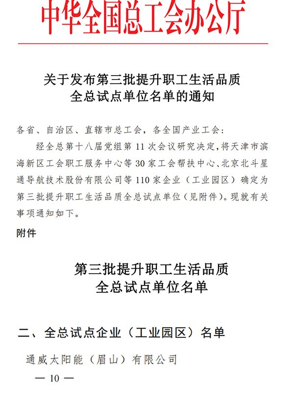 通威太陽能眉山基地獲評全國“塑造職工幸福生活幸福環(huán)境企業(yè)”試點單位