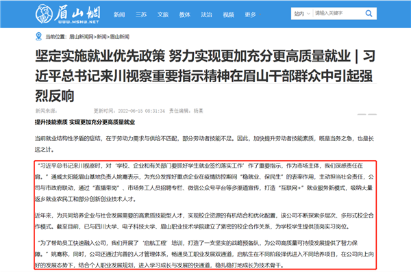 眉山網、眉山日報聚焦通威太陽能眉山基地助力勞動者高質量就業