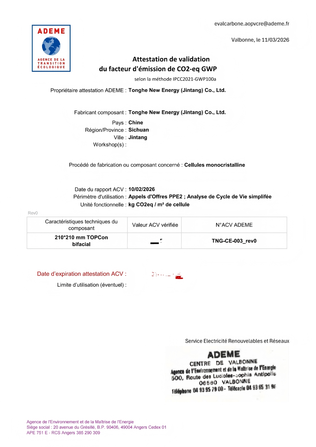 通合新能源(金堂)有限公司電池產品榮獲法國碳足跡認證證書