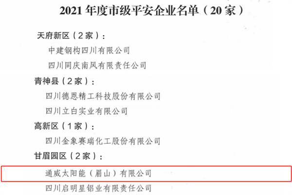 通威太陽能眉山基地榮獲眉山市2021年度平安企業(yè)稱號