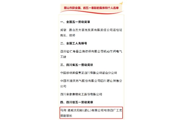 為在全社會大力弘揚勞模精神、勞動精神、工匠精神,激勵廣大職工在全面建設社會主義現代化四川新征程中充分發揮主力軍作用,近日,四川省總工會組織評選了在我省經濟建設、政治建設、文化建設、社會建設、生態文明建設和黨的建設中涌現的先進集體和先進職工,通威太陽能(眉山)有限公司電池四廠工藝部副部長馬列榮獲“四川省五一勞動獎章”表彰。