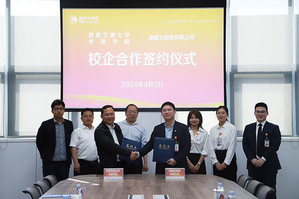 簽約儀式上,通合新能源人力資源部負(fù)責(zé)人代表公司對校方的到訪表示熱烈歡迎,并介紹了公司的基本情況和人才培養(yǎng)策略,并表示,通威太陽能作為全球領(lǐng)先的晶硅太陽能電池企業(yè),深知人才是企業(yè)發(fā)展的核心動(dòng)力,感謝西南交通大學(xué)希望學(xué)院為企業(yè)提供寶貴的人才資源。王書記則介紹了學(xué)院的學(xué)科優(yōu)勢、專業(yè)建設(shè)成果及畢業(yè)生就業(yè)情況,并表示期待與通威太陽能在實(shí)習(xí)實(shí)訓(xùn)、訂單式人才培養(yǎng)、就業(yè)推薦等方面展開深度合作。