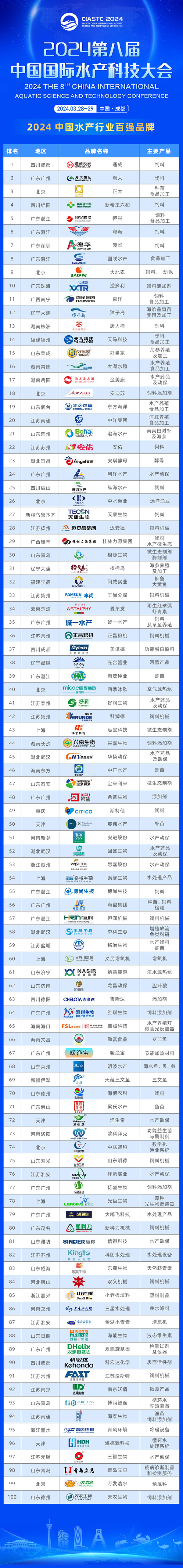 3月28-29日,2024第八屆中國國際水產(chǎn)科技大會在成都通威國際中心隆重舉行。作為大會重要環(huán)節(jié)之一,“2024中國水產(chǎn)行業(yè)百強(qiáng)品牌”全球首發(fā)。