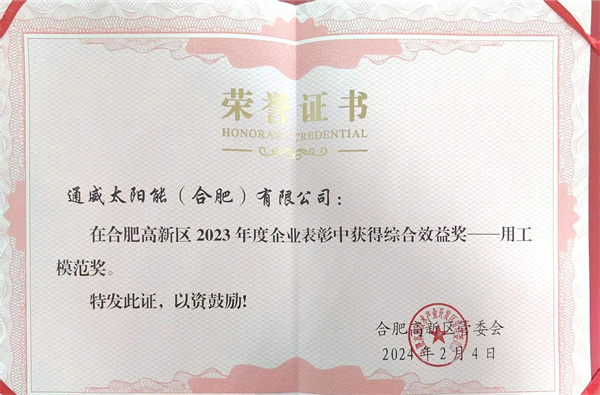 近日,合肥高新技術產業開發區管理委員會對合肥高新區2023年度優秀企業進行通報表彰,通威太陽能(合肥)有限公司獲得“綜合效益獎-用工模范獎”榮譽稱號。