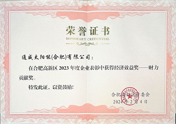 通威太陽能(合肥)有限公司獲得高新區(qū)經(jīng)濟效益獎——工業(yè)財力貢獻前十名