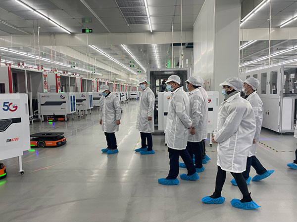 現場評審專家組首先在項目現場聽取了通威太陽能金堂基地發展歷程、5G項目建設情況、網絡基礎設施建設情況、項目生產現場升級及成效價值等整體匯報。隨后信息部負責人帶領領導專家組一行深入金堂S2車間進行了現場考察,并介紹了通威太陽能發展布局、經營狀況、產品特色及5G智能制造場景等,近距離觀摩了5G IGV小車、機械臂等智能化設備的運行及工廠生產系統的運行、調度、數據監測等全流程智能調度情況。領導專家組一行對通威高度智能化的生產現場和精細化的管理模式給予了高度評價,并贊揚公司積極開展5G+工業互聯網應用,助力光伏加速數字化轉型,一致同意該項目通過現場核查。