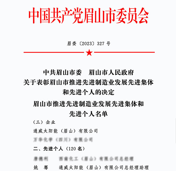 為肯定并鼓舞在推動產(chǎn)業(yè)轉(zhuǎn)型升級、企業(yè)發(fā)展壯大、重點項目引建、服務(wù)保障優(yōu)化等方面取得顯著成績的先進集體和先進個人。近日,眉山市委、市政府決定,對通威太陽能眉山基地予以“眉山市推進先進制造業(yè)發(fā)展先進集體”榮譽表彰,對眉山基地黨總支書記、總經(jīng)理助理姚騫予以“眉山市推進先進制造業(yè)發(fā)展先進個人”榮譽表彰。