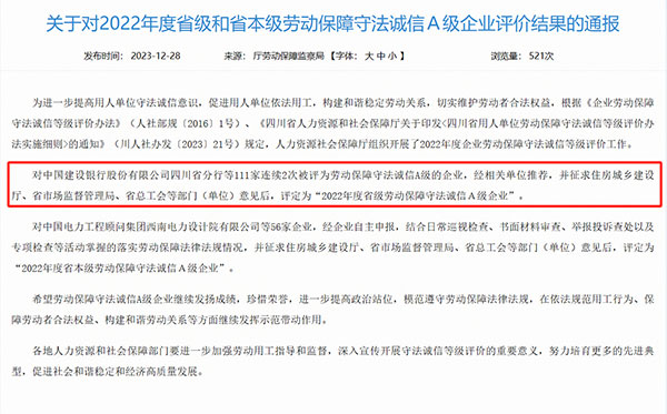 2023年12月28日,由四川省人力資源和社會保障廳評定的2022年度省級勞動保障守法誠信A級企業評價結果揭曉,通威太陽能雙流基地、眉山基地雙雙榮獲“2022年度省級勞動保障守法誠信A級企業”稱號。
