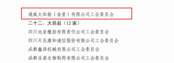 近日,成都市總工會(huì)公布了《2023年四、五星級(jí)企事業(yè)單位工會(huì)及四、五級(jí)鎮(zhèn)(街道)、產(chǎn)業(yè)園區(qū)工會(huì)名單》,通威太陽(yáng)能金堂基地工會(huì)委員會(huì)獲評(píng)“2023年成都市四星級(jí)工會(huì)”。