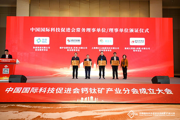 為更好地推進鈣鈦礦電池研究的快速發(fā)展,加強鈣鈦礦產(chǎn)、學(xué)、研的國際交流,會議期間中國國際科技促進會特別成立“中國國際科技促進會鈣鈦礦產(chǎn)業(yè)分會”。通威太陽能(成都)有限公司成為“中國國際科技促進會理事單位”及“科促會鈣鈦礦產(chǎn)業(yè)分會副會長單位”。光伏研究院院長蔣方丹博士受聘為“科促會鈣鈦礦產(chǎn)業(yè)分會副會長”。