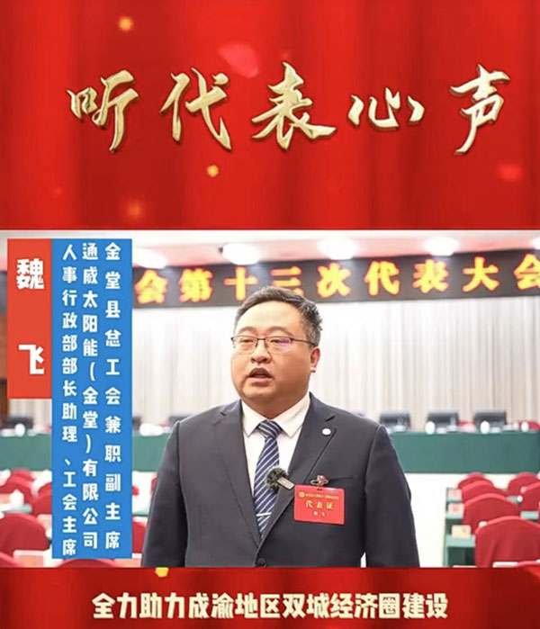 會(huì)中,魏飛接受采訪表示,作為光伏產(chǎn)業(yè)一線工人代表參會(huì)并當(dāng)選,深感責(zé)任重大,接下來(lái)將堅(jiān)定信心、立足崗位,著力服務(wù)中心、服務(wù)大局,把個(gè)人和企業(yè)的成長(zhǎng)融入到金堂縣高質(zhì)量發(fā)展的大局中,貢獻(xiàn)通威工人力量。