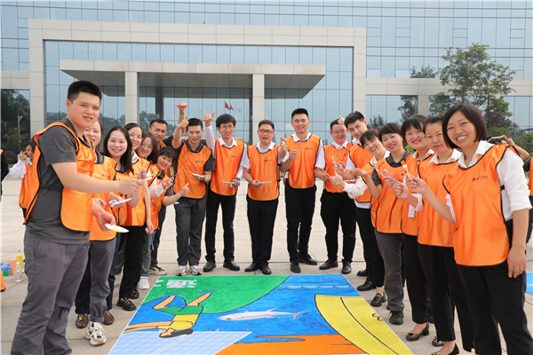 在各基地活動現場,50平方的巨幅納斯卡畫卷被等分成五個部分由百名員工分組進行繪制,既明確分工,又相互協作,他們在潔白的畫卷上用藍色、橙色、黃色、綠色、紅色……勾勒出一幅幅通威畫卷,或以智能化車間、花園式工廠的繪制展現通威太陽能在集團的引領下向著“光伏改變世界”企業愿景,聚勢聚焦、做專做精,為實現“碳中和”目標而貢獻智慧和力量的真實寫照;或以漁光一體畫面展示出“通威,為了生活更美好”的美好愿景,向集團40年崢嶸歲月與雙主業發展的良好勢頭致敬;亦或以“青山”登高,綠水“揚帆”來表現全體通威人通力合作,為了“綠水青山”偉大愿景,為了生活更美好而不懈努力的奮斗之志。