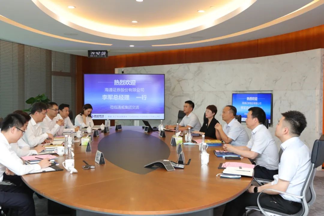 6月22日,海通證券股份有限公司黨委副書記、總經理李軍,四川分公司總經理劉宏志一行蒞臨通威參觀交流。通威集團董事局劉漢元主席、集團禚玉嬌總裁熱情接待并座談,集團財務總監肖吉華陪同接待。