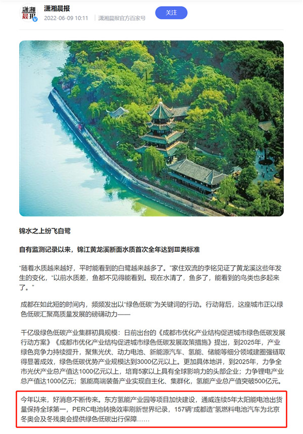 報道指出,“通威連續5年太陽能電池出貨量保持全球第一,PERC電池轉換效率刷新世界紀錄” ,報道對通威太陽能加快綠色低碳產業集群發展給予充分肯定。