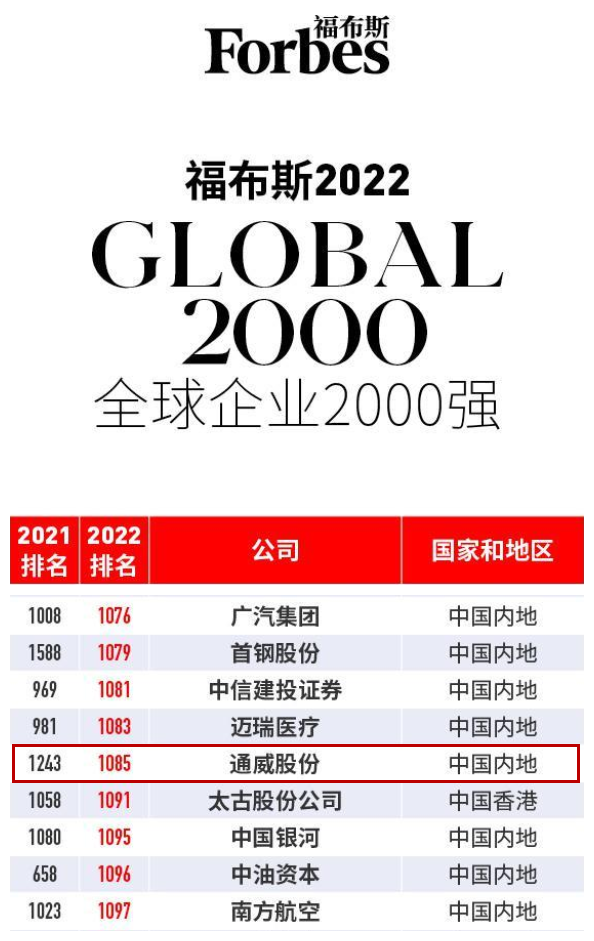 通威股份榮登《福布斯》2022年全球企業2000強榜單