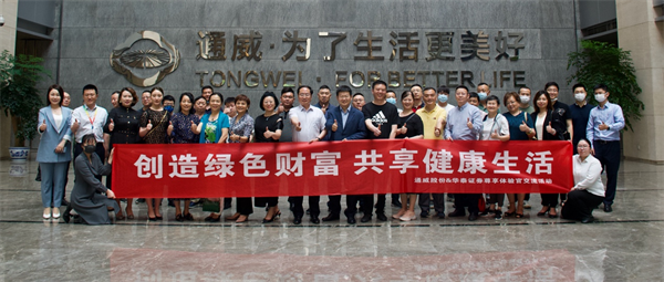 5月12日,由通威股份和華泰證券聯合策劃組織以“創造綠色財富,共享健康生活”為主題第九期尊享體驗官交流活動在通威國際中心隆重舉行。華泰證券四川分公司總經理李輝一行30余位高凈值客戶蒞臨通威參觀交流。通威股份副董事長嚴虎、通威股份董事會秘書嚴軻、通威食品人力資源總監黃勁松、通威全農惠公司總經理王珊等一起座談并全程熱情接待。