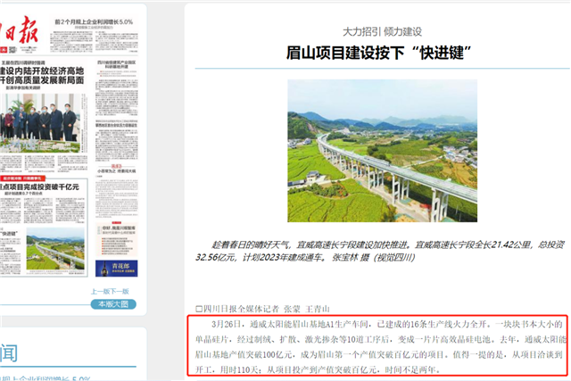 《四川日報》在報道中提到,去年,通威太陽能眉山基地產值突破100億元,成為眉山第一個產值突破百億元的項目。值得一提的是,從項目洽談到開工,用時110天;從項目投產到產值突破百億元,時間不足兩年。