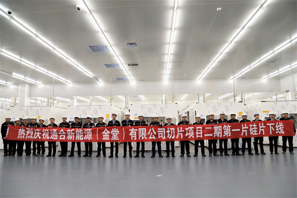 2月25日,在通合新能源Q1車間現場工作人員熱切注視下,伴隨著熱烈的掌聲,通合新能源切片項目二期第一片硅片下線,通合新能源總經理助理郭寬新攜骨干員工共同見證這一令人振奮的時刻。