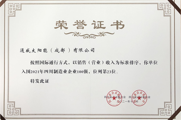 12月29日,2021四川企業100強發布會在成都召開。會上,四川省企業聯合會推出《四川企業發展報告(2021)》并發布2021年四川企業100強、制造業企業100強等榜單,通威太陽能雙流基地、眉山基地分別榮列四川制造業百強企業第23位、第86位。