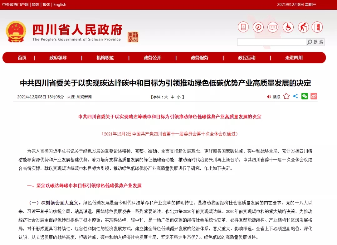 12月8日,《四川日報》客戶端發(fā)布《中共四川省委關于以實現(xiàn)碳達峰碳中和目標為引領推動綠色低碳優(yōu)勢產(chǎn)業(yè)高質量發(fā)展的決定》(以下簡稱《決定》)全文。與此同時,四川省人民政府新聞辦公室官方微政務賬號《四川發(fā)布》正式發(fā)布四川省委彭清華書記關于《決定》的說明。《決定》指出,積極舉辦中國國際光伏產(chǎn)業(yè)高峰論壇、世界動力電池大會、國際鋰電產(chǎn)業(yè)大會等國際性重大展會活動,以高水平會展帶動產(chǎn)業(yè)集聚發(fā)展。這意味著,由通威集團發(fā)起,并聯(lián)合中國能源研究會、中國光伏行業(yè)協(xié)會、全國工商聯(lián)新能源商會、亞洲光伏產(chǎn)業(yè)協(xié)會、中國有色金屬工業(yè)協(xié)會等主辦單位,通威傳媒承辦的“中國國際光伏產(chǎn)業(yè)高峰論壇”正式被寫入中共四川省委十一屆十次全會《決定》之中。
