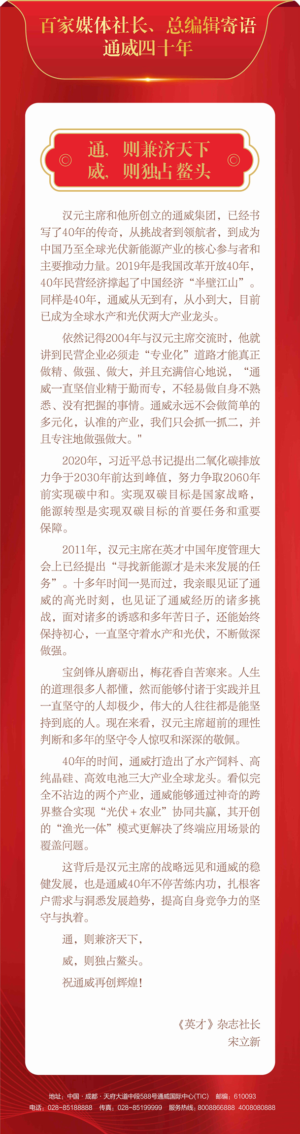 百家媒體社長、總編輯寄語通威四十年丨通,則兼濟天下;威,則獨占鰲頭
