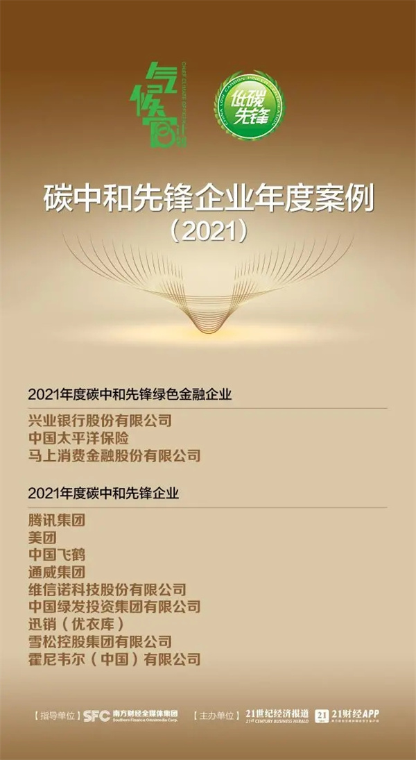 與此同時(shí),碳中和先鋒企業(yè)年度案例(2021)正式發(fā)布,通威集團(tuán)與騰訊、美團(tuán)等九家企業(yè)共同入選“2021年度碳中和先鋒企業(yè)”年度案例,并榮獲“2021年度碳中和先鋒企業(yè)”稱號。通威集團(tuán)作為我國唯一一家新能源企業(yè)入選該案例并獲獎(jiǎng),展現(xiàn)了社會(huì)各界對于通威多年來始終堅(jiān)持綠色低碳發(fā)展,積極助力并打造“碳達(dá)峰、碳中和”“通威樣本”的高度認(rèn)可。