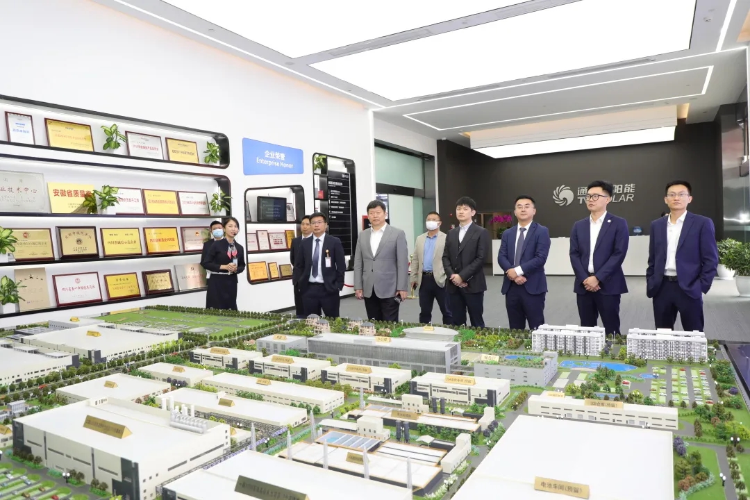 馮董事長一行先后參觀了通威太陽能A1展廳、智能制造生產車間和集團體驗中心,詳細了解了通威39年來“發端于水產,成長于農牧,跨越于新能源”的創業歷程,對通威綠色生態發展理念、綠色農業與綠色能源高效協同發展、智能化生產水平,以及多年來穩健發展取得的成績給予高度評價。