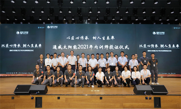 為進(jìn)一步推進(jìn)內(nèi)訓(xùn)師隊(duì)伍建設(shè),感恩在通威太陽(yáng)能人才培養(yǎng)項(xiàng)目中辛勤付出的內(nèi)訓(xùn)師們,9月10日,合肥、雙流、眉山、金堂四個(gè)基地同步開(kāi)展“以匠心傳承,樹(shù)人生表率”為主題的內(nèi)訓(xùn)師授證儀式,通威太陽(yáng)能首席運(yùn)營(yíng)官蕭圣義、合肥基地總經(jīng)理謝泰宏、金堂基地副總經(jīng)理翟緒錦、安全顧問(wèn)張忠文、總經(jīng)理助理陳君、眉山基地總經(jīng)理助理蔣衛(wèi)朋出席活動(dòng),四地共計(jì)130余人參加。