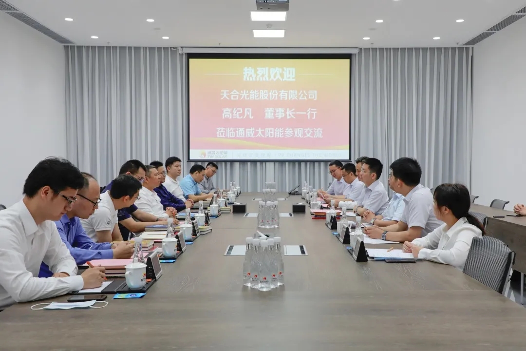 9月11日,天合光能股份有限公司董事長高紀凡一行蒞臨通威太陽能金堂基地、通合新能源項目參觀交流,通威股份董事長謝毅,通威太陽能董事長兼總經理周丹,通威太陽能首席運營官蕭圣義,通威太陽能副總經理周華,通威股份光伏商務部電池營銷副總經理薛青松,通威太陽能金堂基地副總經理翟緒錦,通合新能源總經理助理羅曉云、郭寬新等熱情接待。