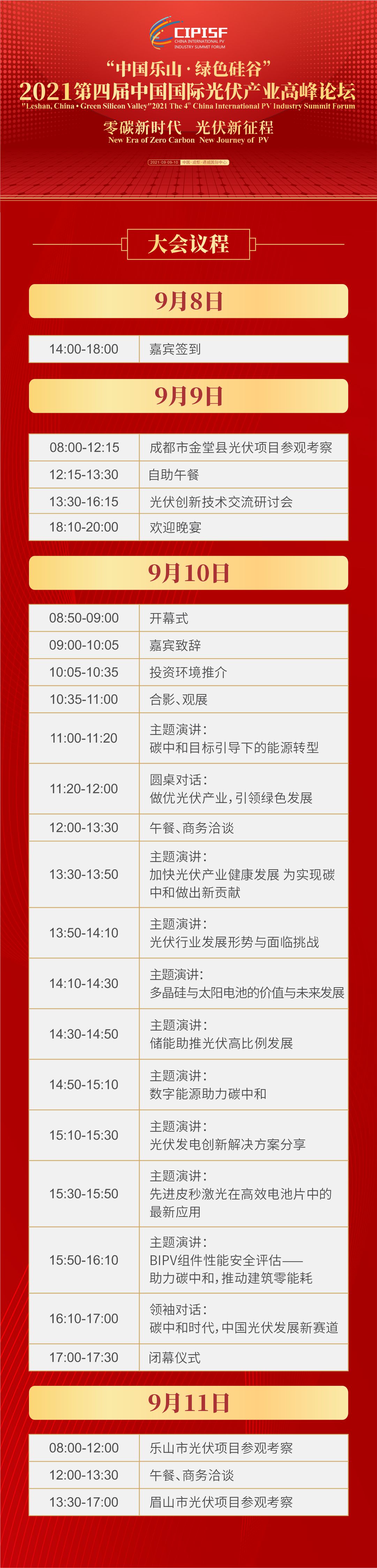 9月9日-10日,2021第四屆中國國際光伏產業高峰論壇將于成都通威國際中心隆重舉行。本屆論壇在連續三屆成功舉辦的基礎上,以“零碳新時代 光伏新征程”為主旨,匯聚光伏產業各界權威,圍繞中國光伏產業發展的焦點問題,展示前沿成果,并搭建“政、產、學、研、金”為一體的高端合作平臺,促進產學研深度合作,為各界創造專業化合作交流與協同創新平臺。