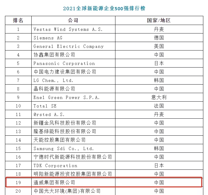 “2021全球新能源企業(yè)500強榜單”主要以企業(yè)上一年度營業(yè)收入、研發(fā)創(chuàng)新投入等核心運營指標(biāo)為評測依據(jù),是衡量全球大型新能源企業(yè)發(fā)展規(guī)模、可持續(xù)增長能力等綜合實力的一項權(quán)威排名,已成為反映全球新能源產(chǎn)業(yè)發(fā)展基本特點、最新變化和重要趨勢的風(fēng)向標(biāo)。通威憑借在新能源領(lǐng)域穩(wěn)健快速的發(fā)展實力再次上榜。