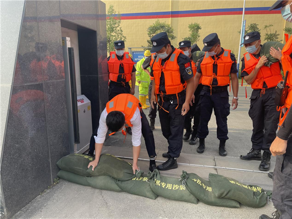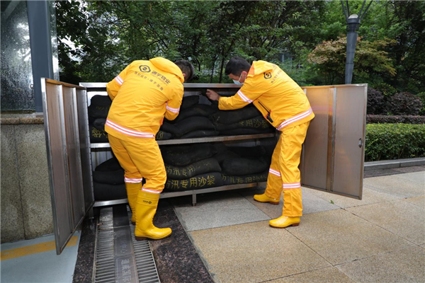 通威國(guó)際中心排查小組檢查防汛沙袋