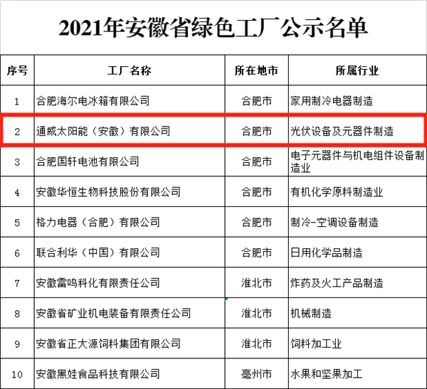 近日,安徽省經濟和信息化廳官網公示了“2021年安徽省綠色工廠名單”,經過企業自主申報、市經濟和信息化主管部門審核推薦、省廳初審、專家評審等程序,通威太陽能合肥基地以合肥市排名第一的優異成績被推薦至省廳,再經過激烈角逐,順利通過評定,榮獲“2021年安徽省綠色工廠”稱號,為全省60家企業之一。