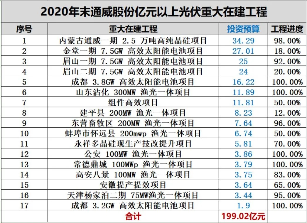 事實上,通威股份很多重大在建工程也都進(jìn)入收官階段。據(jù)黑鷹光伏統(tǒng)計,截止2020年末,通威股份有17個億元以上的光伏重大在建工程,總投資預(yù)算達(dá)199.02億元,其中14個項目的工程進(jìn)度在50%以上,10個項目工程進(jìn)度超過80%。