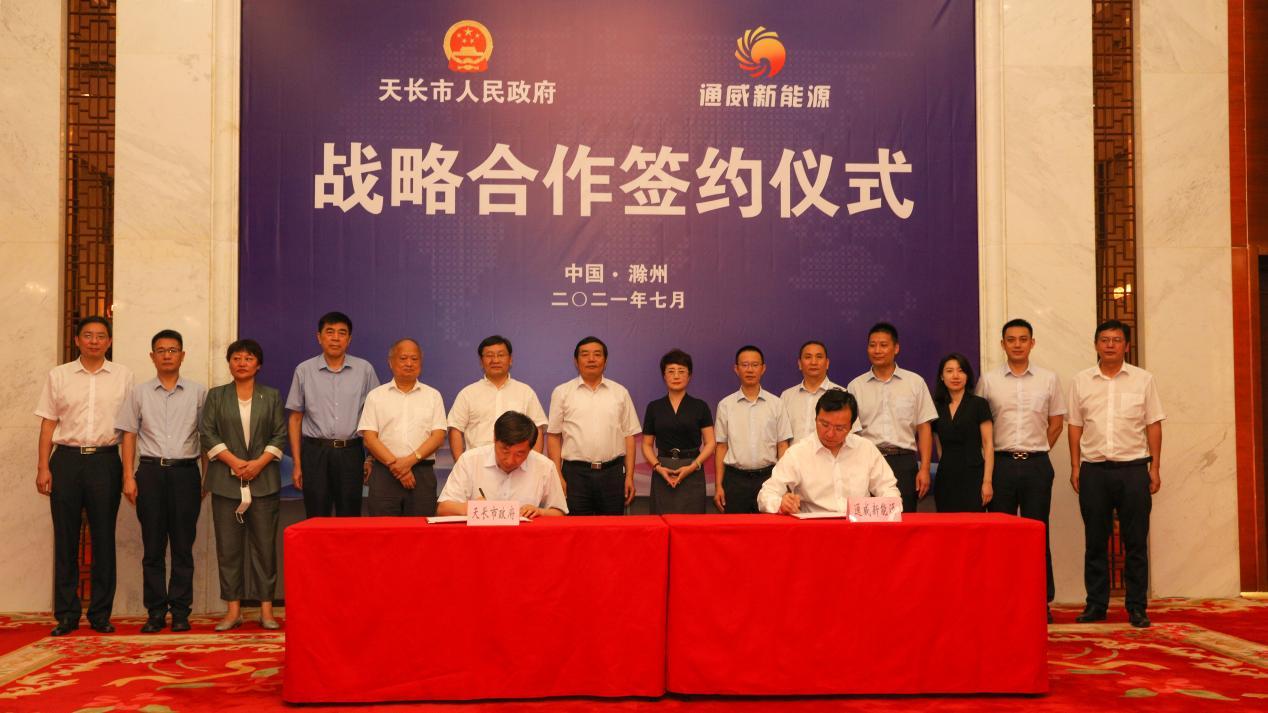 7月28日,安徽滁州通威“漁光小鎮”項目簽約儀式在滁州市政務中心成功舉行。滁州市委書記許繼偉,市委副書記、市長吳勁,市人大常委會主任王圖強,市政協主席汪建中,市委副書記、常務副市長金力,天長市委書記鄧繼敢,天長市委副書記、市長賀家平,滁州市、天長市相關部門負責人,通威集團禚玉嬌總裁,通威新能源執行董事兼總經理邱艾松,通威新能源業務二公司總經理楊勇出席簽約儀式。簽約前,許繼偉書記、吳勁市長會見了禚總一行,并座談交流。