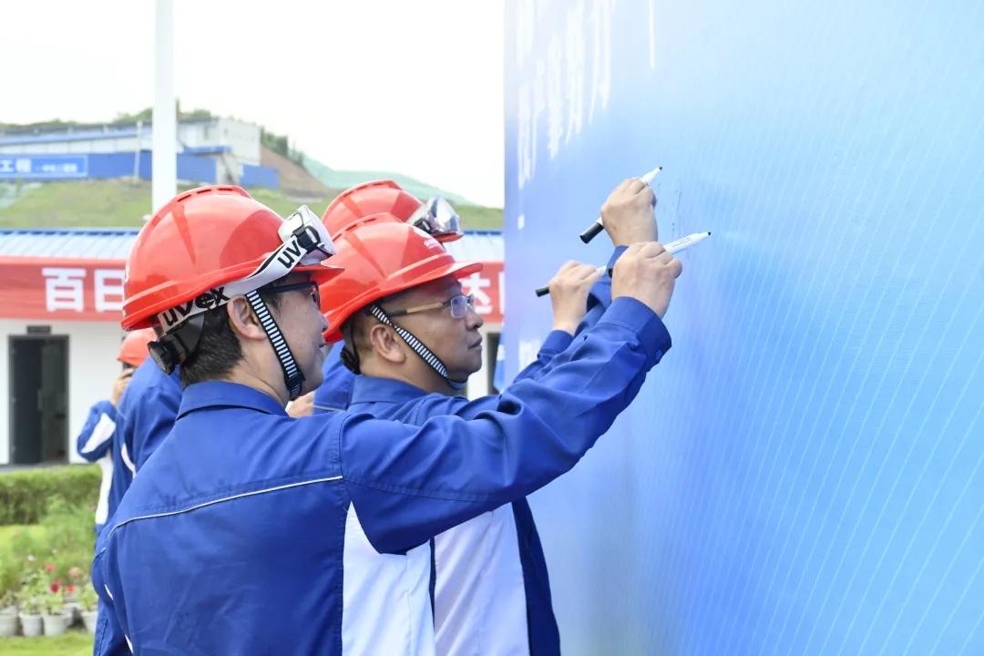 誓師大會現(xiàn)場 會上,各專業(yè)組代表分別就“百日沖刺”進行表態(tài),并表示,定將全力以赴,想盡辦法搶工期,完成達標達產(chǎn)的目標。隨后,施工單位代表進行表態(tài)發(fā)言,將密切配合工程建設(shè)需要的一切要求,做實、做好工程,為項目按既定計劃投產(chǎn)貢獻積極力量。 羅總表示,項目建設(shè)時間緊、任務(wù)重,要想辦法、拿措施應(yīng)對接下來的挑戰(zhàn)。要在確保施工安全和保證施工質(zhì)量的前提下?lián)屪ミM度。要利用好清單開展工作,要將我們喊出的口號執(zhí)行落地。各專業(yè)組和施工單位要加強協(xié)調(diào)配合,凝聚力量,共同奮斗。 全員簽訂“軍令狀” 李董指出,“奮戰(zhàn)一百天”要對工作量做到心中有數(shù),將任務(wù)目標細化到每日追蹤確認,確保工程推進。各施工單位要積極增加施工人員、機具,搶取一切可利用的施工時間。專業(yè)組和屬地要加強協(xié)調(diào)配合,全力搶抓設(shè)備安裝進度。李董強調(diào),精品工程一定是安全高效、質(zhì)量可靠,全體干部員工和施工單位要有咬定青山不放松的精神,鎖定目標,奮戰(zhàn)100天,勇創(chuàng)佳績!