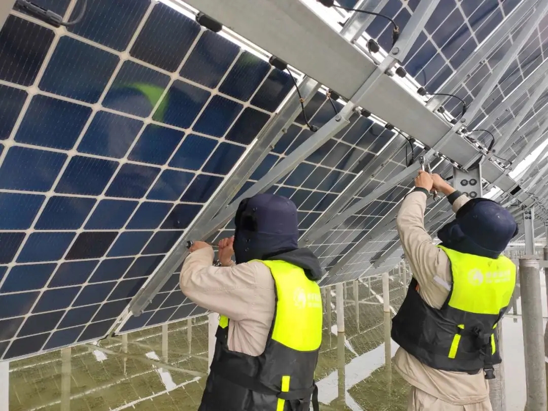 在與臺風戰斗的過程中,運維團隊總結并借鑒其他基地經驗,明確要防臺風,就要先了解臺風、了解不同路徑的臺風對組件產生的影響。因此,經過分析研判,明確了臺風帶來的主要損失點,制定了有針對性的解決方案,如定期檢查,緊固螺栓,及時消缺;定期檢查維護,提前清理藤蔓、樹木等,重點解決組件、支架被吹翻的風險以及送出線路故障等問題。嚴格遵照公司標準化管理文件,制定從年度到季度、月、周的詳細工作計劃,并且嚴格執行。緊固螺栓是防止組件、支架被吹飛最有效的方法,而這項工作,只能人工操作。在臺風季到來前,根據預案,每名運維人員每月平均緊固螺栓幾萬顆;每月固定時間對送出線路進行專項巡視,確保了電站安全生產 。在面對洪水時,運維團隊不僅要守好光伏區的安全防線,更要協助漁業養殖的同事加固圍欄,盡可能減少公司財產損失。