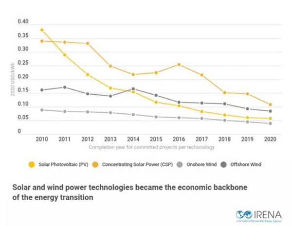 2020年可再生能源發電成本顯示,可再生能源技術成本同比繼續大幅下降。聚光太陽能 (CSP) 下降 16%,陸上風能下降 13%,海上風能下降 9%,太陽能光伏下降 7%。由于成本較低,可再生能源也越來越多地削弱了現有煤炭的運營成本。低成本的可再生能源為發達國家和發展中國家提供了一個強有力的商業案例,可以為過去的煤炭發電以追求凈零經濟。僅2020 年新增的可再生能源項目就將為新興經濟體在其生命周期內節省高達1560億美元的資金。