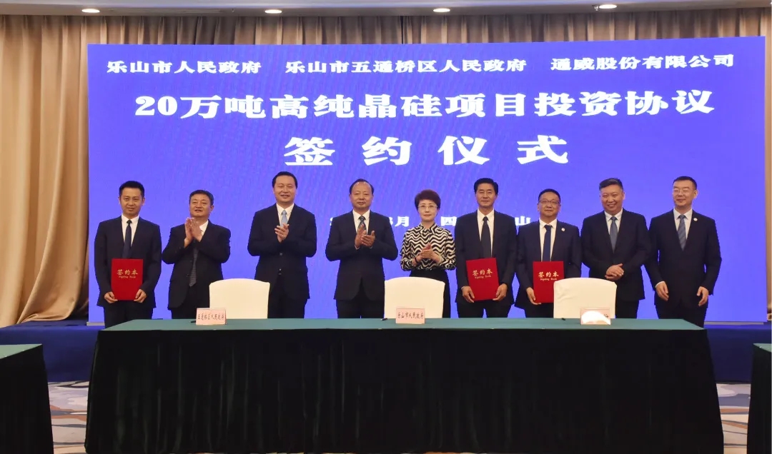 6月30日,通威股份20萬噸高純晶硅項目投資協議簽約儀式在樂山成功舉行。通威股份和樂山市政府、五通橋區政府正式簽訂了《20萬噸高純晶硅項目投資協議》。樂山市委書記馬波,樂山市委副書記、市長張彤,通威集團禚玉嬌總裁,永祥股份董事長兼總經理李斌等領導出席簽約儀式。