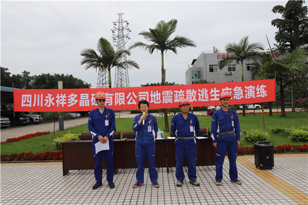 為進一步加強企業安全工作,貫徹“安全生產月”活動有關精神,增強員工安全意識,6月18日,永祥多晶硅組織開展模擬地震疏散演練活動,永祥多晶硅總經理劉逸楓、副總經理汪云清、安全環保總監牟俊豐、總經理助理彭勇以及各部門相關人員參加演練。