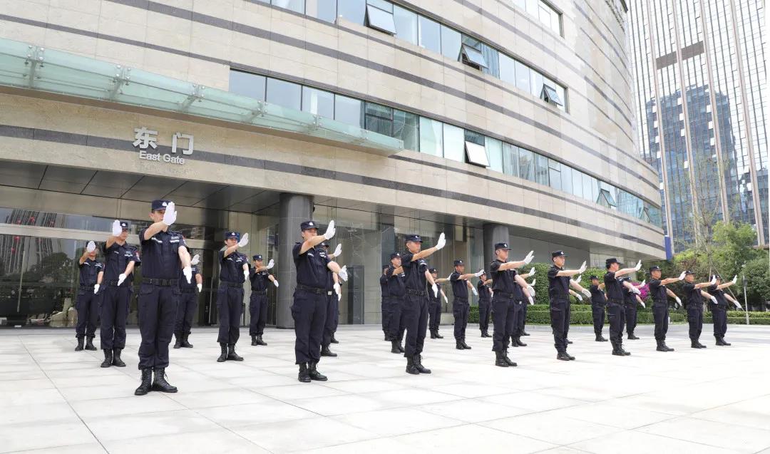大練兵活動結束后,國際中心全體員工同步執行了準軍事化訓練,員工們紛紛向秩序隊員對標,嚴格按教官命令執行操作,對每一種軍姿認真領會,反復訓練,力求達到準軍事化標準。自2013年起,通宇物業團隊每周五下午4點風雨無阻地準時進行軍事訓練,至今已堅持不懈地執行了八年。
