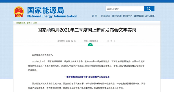 2021年4月29日,國家能源局召開二季度網(wǎng)上新聞發(fā)布會,發(fā)布2021年一季度能源形勢、可再生能源發(fā)展情況,全國50個主要城市供電企業(yè)用戶供電可靠性指標(biāo),以及慶祝中國共產(chǎn)黨成立100周年電力安全保障工作情況、智能化煤礦建設(shè)有關(guān)情況等并回答記者提問。