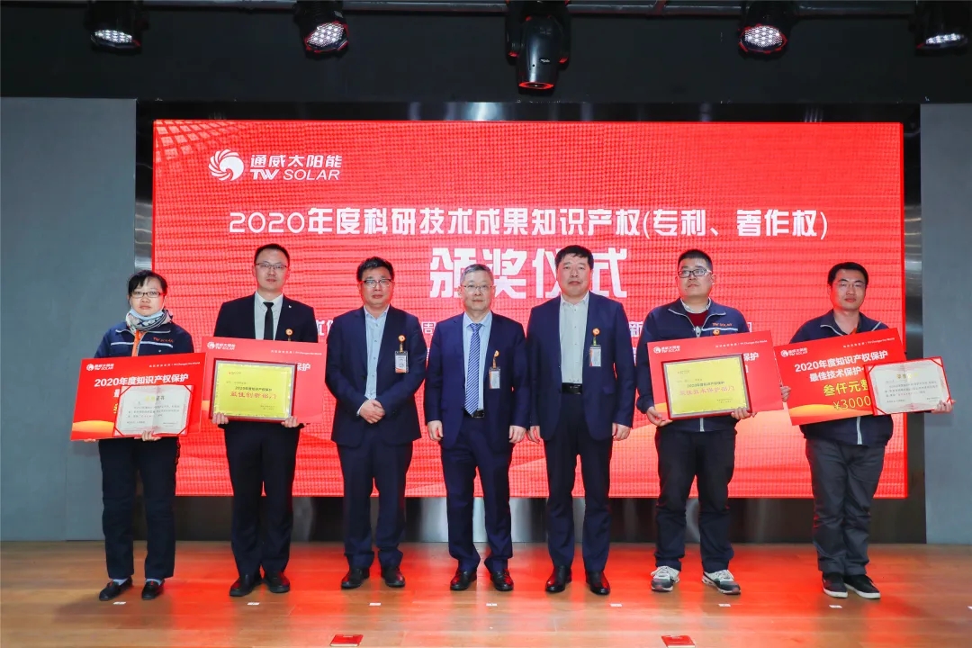 4月13日,通威太陽能2021年科技創新頒獎會暨2020年科研技術成果知識產權頒獎儀式在雙流基地隆重舉行,通威股份光伏首席技術官邢國強、通威太陽能首席運營官蕭圣義及光伏研究院院長劉正新出席活動,通威太陽能合肥、雙流、眉山、金堂四地中高管、部門負責人及相關部門代表現場或視頻參會。