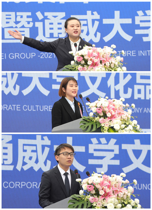 作為企業文化踐行代表,通威新能源執行董事兼總經理邱艾松分享了通威新能源企業文化建設的心得體會以及塑造一支“文化建設我先行、爭做先鋒當表率”的管理團隊,營造文化建設“共建共享”氛圍的舉措和信心。永祥股份潘爰原、通威太陽能朱敏、通威股份楊正文分享了企業文化在提升團隊執行力,激發員工內驅力方面的一線故事和個人感悟,聲情并茂的分享引發現場共鳴,爆發熱烈掌聲。